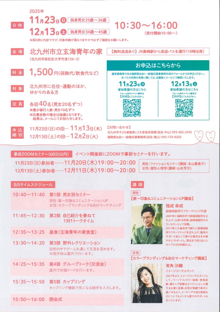 2025年11月23日(日) 独身男女:25歳~36歳 対象 ※申込締切:11月23日(木)