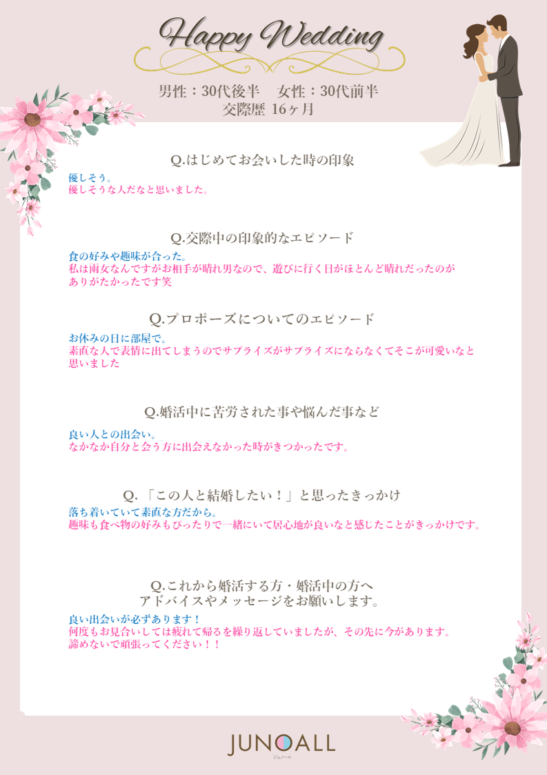 先日成婚のご報告をいただいた会員様よりアンケートとお写真を複数いただきました。